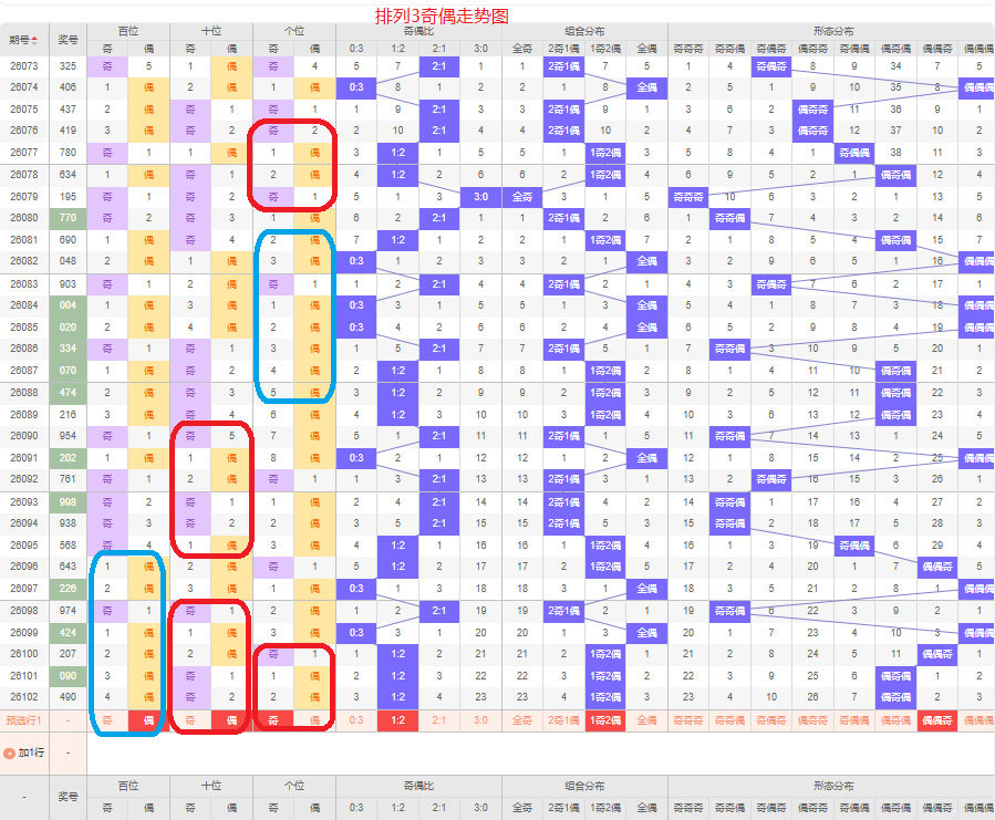 上一期的奇偶比为1:2,两偶的号码组合,从近五期的奇偶数出现情况看,奇数出5次,偶数出现10次,奇数号码出现较少,本期要侧重两偶的号码组合,侧重偶偶奇或偶奇奇的号码组合,根据奇偶组合形态可做五码定位02468/02468/13579或02468/13579/13579