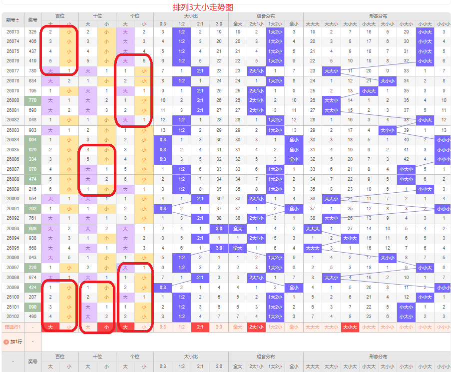 上一期大小比为1:2,两小的号码组合,近五期大号出5次,小号出10次,大号码出现较少,上一期是两小的号码组合,本期侧重两大的号码组合,百位侧重大号码,十位侧重小号码,个位侧重大号码,侧重大小大或者大大小的号码组合,根据大小形态五码定位56789/01234/56789或者56789/56789/01234