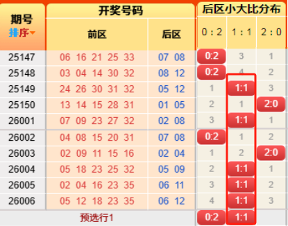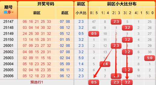 上期前区小大比2:3,新的一年新的总计6期中6期。言归正传我们继续用历史数据说话,前区小大比分成6种0:5、1:4、2:3、3:2、4:1、5:0(如图),我统计了一下历史出现次数,0:5出现107次、1:4出现515次、2:3出现979次、3:2出现814次、4:1出现355次,5:0出现54次,再看近10期小大比出现次数比为1:1:3:4:0:1,通过历史数据对比观察以及根据遗漏对称理论原则,故本期我们选择2:3、3:2、0:5;(具体精准方向请查看小车小大比精选)