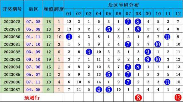 上期后区号码为04号和05号,为小小、偶奇组合,近5期奇偶比为7:3,大小比为7:3,本期预测后区五码复式参考02 05 06 08 12,重点两码推荐08 12。