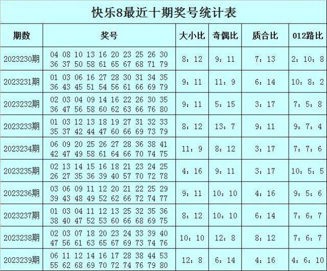 福彩快乐8第2023239期开奖回顾:06 11 12 14 16 17 28 38 44 53 55 62 68 69 70 72 74 76 79 80,其中奖号大小比开出12:8,奇偶比开出6:14,质合比开出4:16,012路比开出4:6:10。