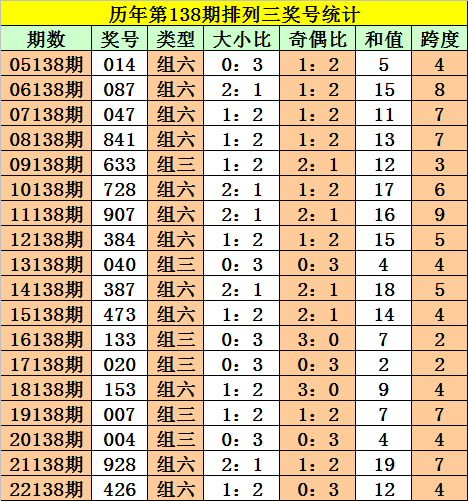 排列三第2022138期奖号:426,和值12,跨度4,大小比1:2,奇偶比0:3。