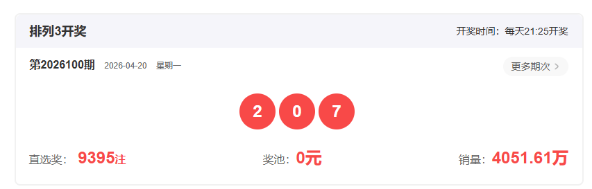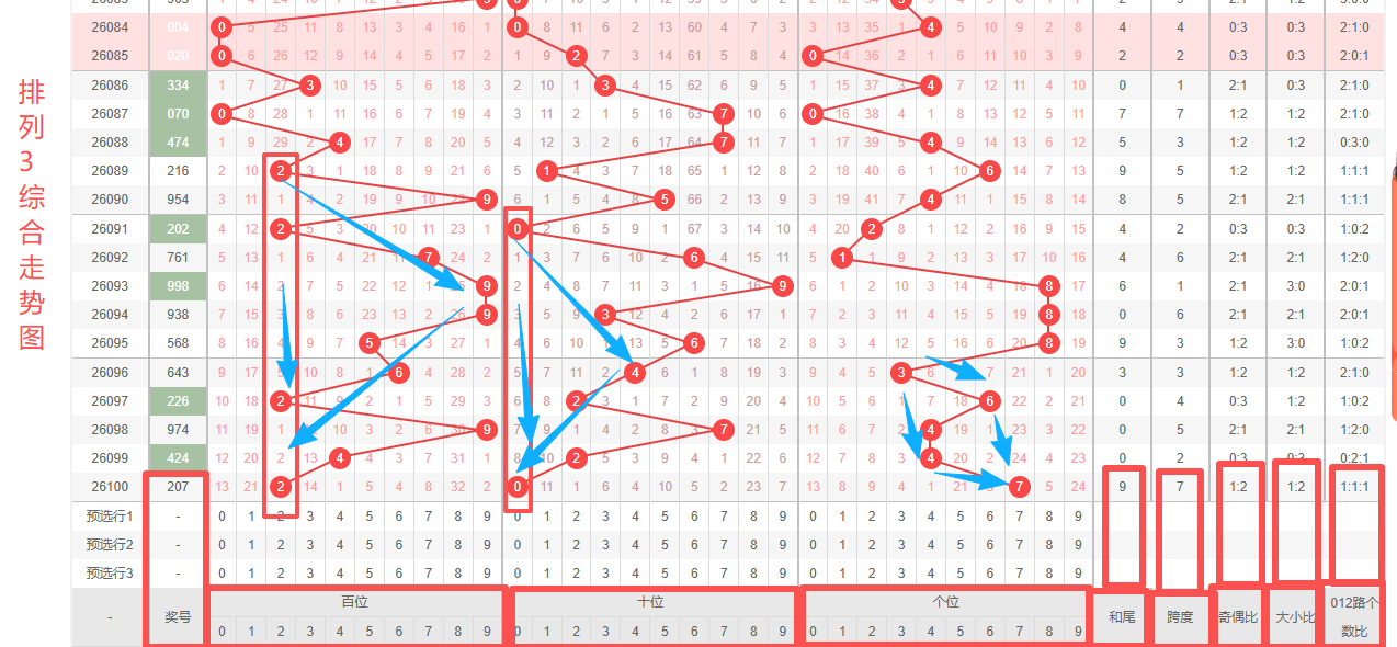 体彩排列3第2026100开奖号码207,形态为组六,奇偶比1:2,和值9,跨度7,大小比1:2,【012】路个数比1:1:1。