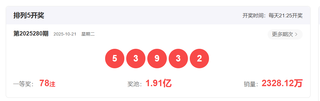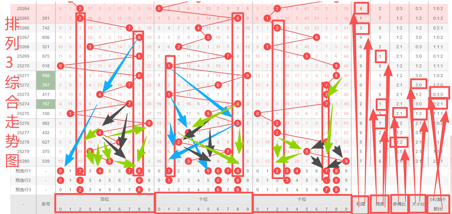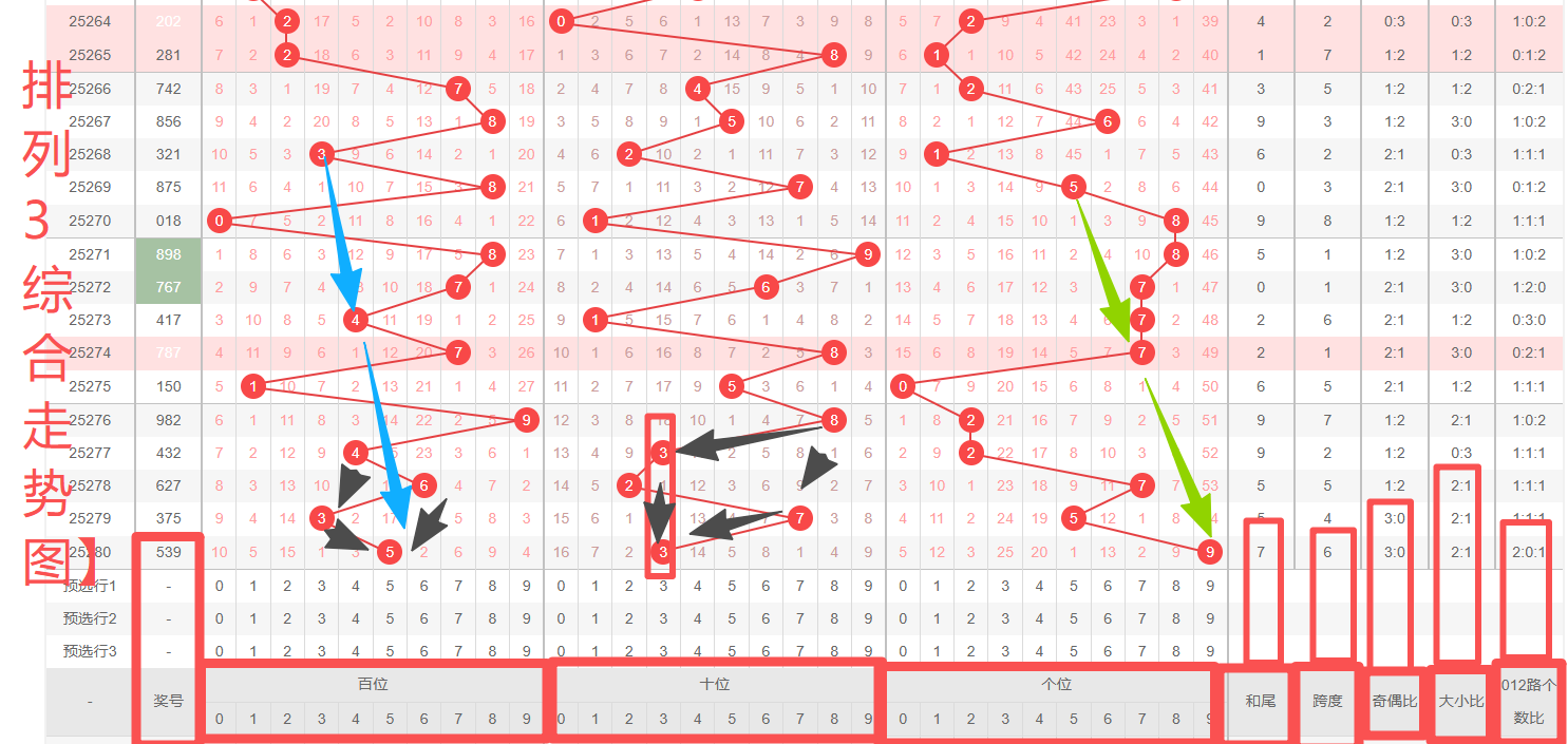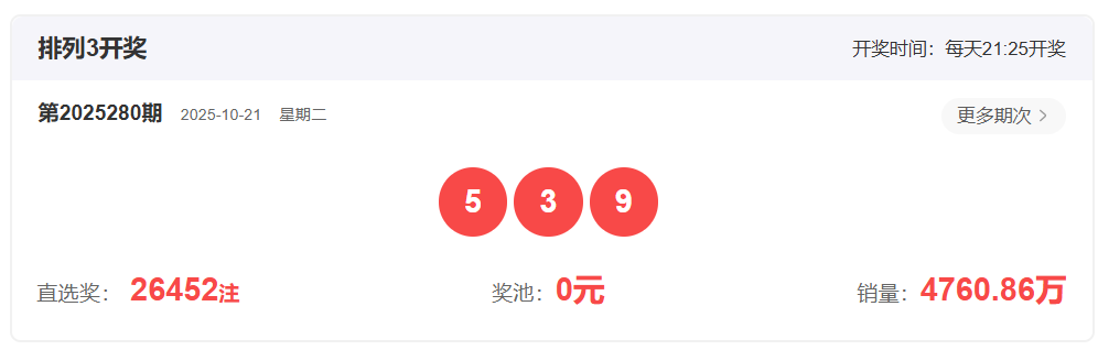 体彩排列3第2025280开奖号码539,形态为组六,奇偶比3:0,和值17,跨度6,大小比2:1,【012】路个数比2:0:1。