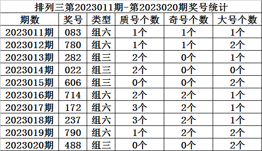 上期回顾:排列三第2023020期开奖:488,质合比为0:3,奇偶比为2:1,大小比为0:3。
