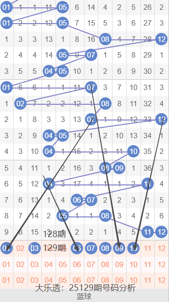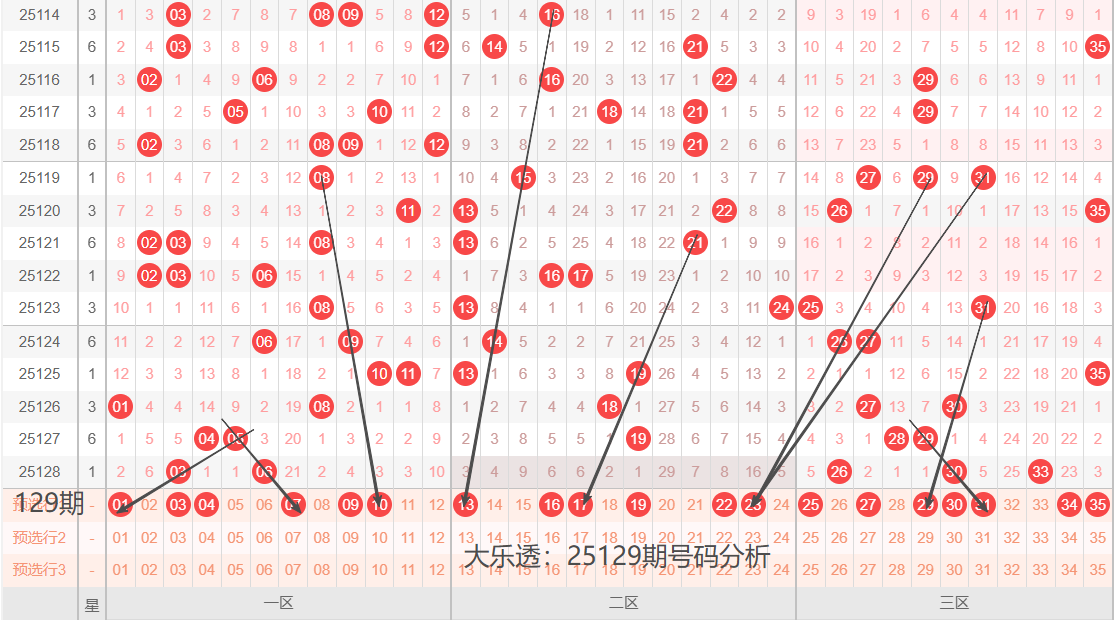 通过上期号码的简单分析,我们看下25129期红色号码球的总体走势,如下图:
