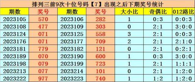 在十位前9次出现号码7后,其下期奖号分别开出:8-0-5-0-2-0-2-0-4,其中奖号个数012路比是4:1:4,奇偶比是1:8,大小比是2:7。