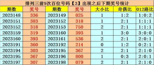 在百位前9次出现号码3之后,下期百位分别开出奖号:0-3-7-3-5-2-3-8-0,其中开出号码个数奇偶比是5:4,大小比是3:6,012路比是5:1:3。