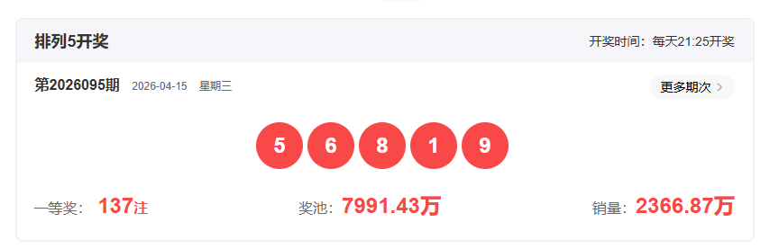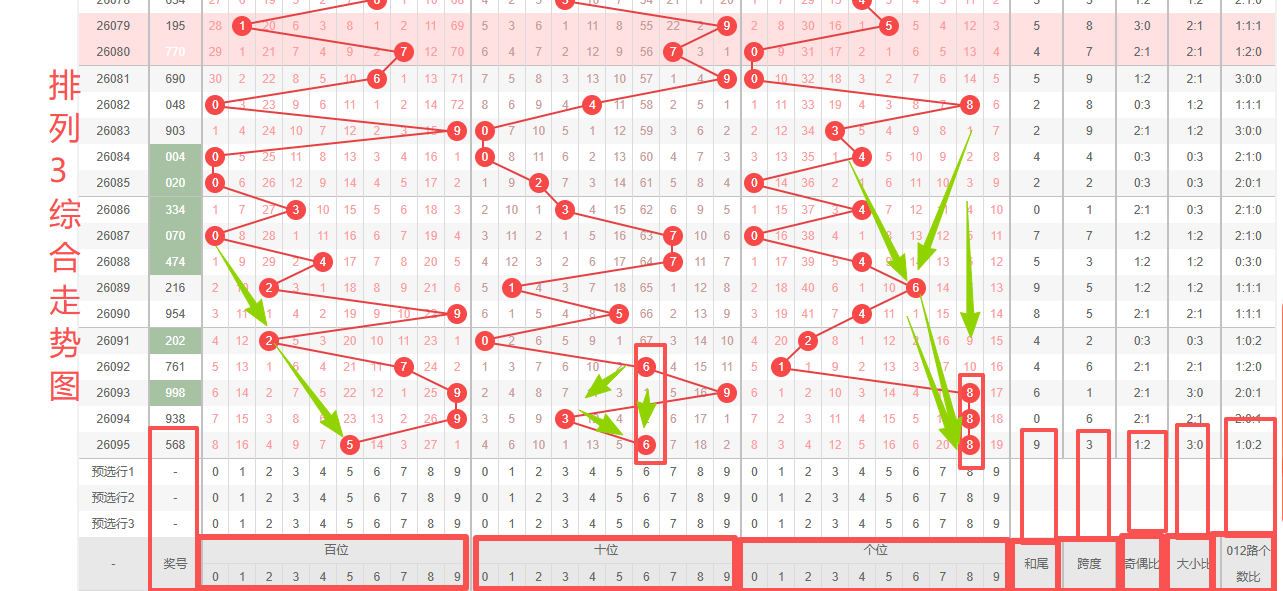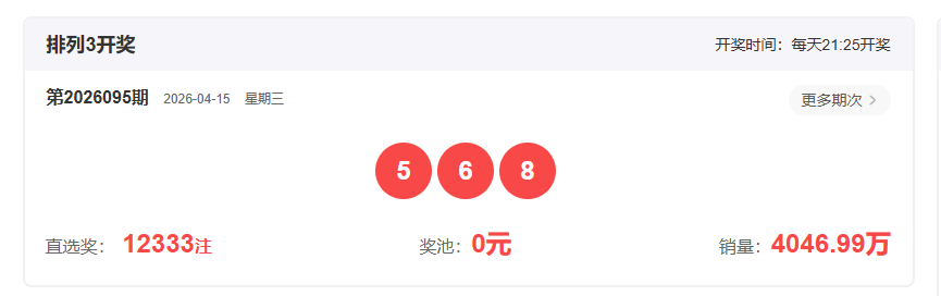 体彩排列3第2026095开奖号码568,形态为组六,奇偶比1:2,和值19,跨度3,大小比3:0,【012】路个数比1:0:2。