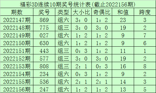 开奖回顾:福利彩票3D第22156期奖号开出247。奖号类型为组六,奇偶形态为偶偶奇,大小形态为小小大。