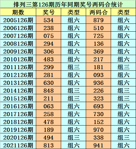 在历年同期中两码合开出年限分别为:3出现8年,9出现7年,1出现6年,2、6、7出现5年,0出现4年,5、8出现3年,4出现1年,第2022126期预计两码合出现:0、1、9。