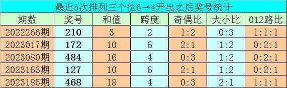 1、排列三前两期个位分别开出号码6和4,历史上个位号码连续两期分别出现6和4时,共有70次。在最近5次出现时,其下期分别出现号码:210、172、484、127、468;