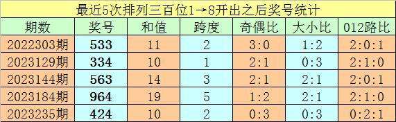 1、排列三最近两期百位号码分别开出1和8,历史上百位号码连续两期分别开出1和8的奖号出现了75期。前五期开出之后其下期奖号分别为:533、334、563、964、424;