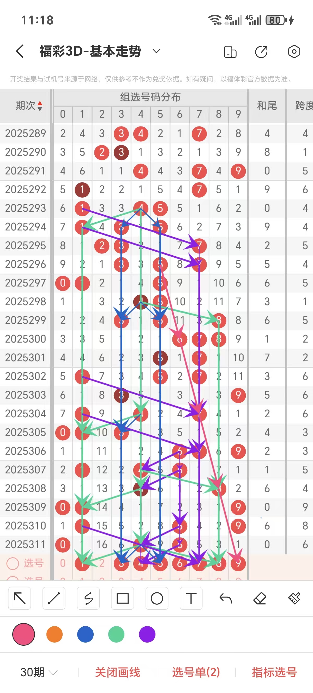 跨度通常情况下在五期之内重复一个跨度的概率很高,近五期没有重复的跨度,近五期跨度为5/4/9/8/6,近期02路的跨度较热,上期是0路的跨度,本期要侧重跨度以5/7跨为主的号码组合。可以从跨度方面选择相应的双胆码组合,双胆码的选取要根据近期和历史的走势进一步的分析选取。