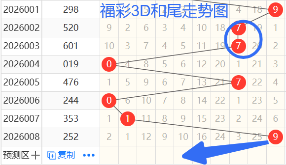 们依次是07019和尾,按照012路排序是01010路和尾,后面两期不是同路,今天就是1路0路的和尾,为什么这么讲呢,这个是个大概率的问题,也是根据长期的研究规律定的,准确率相当高,我定了1 0路的和尾,也就是1470369和尾,那么我们再来看和值,按照和值除3余数的话,可以分为余0 1 2路. 那么我们来看004期和值10余1,005期和值17余2,006期和值10余1,007期和值11余2,008期和值9余0,那么本期看和值看余2和余0,根据上面的和尾那么就只有11 14 17 9 6 21和值。