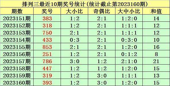 上期回顾:排列三第2023160期奖号为:393。奖号类型:组三,和值:15,奇偶比:3:0,跨度:6,大小比:1:2。