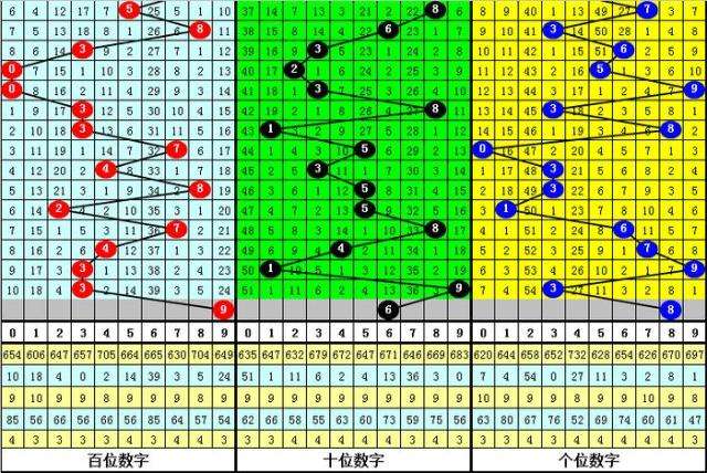 大中小分析:在组选0-9号码分布图中,前10期小号(0-2区段)出现5枚奖号,中号(3-6区段)出现16枚奖号,大号(7-9区段)出现9枚奖号,上期0小号区域断区,本期注意小号走冷,防0-2区段断区。