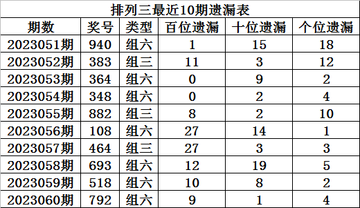 上期回顾:排列三第2023060期奖号:792,组六,直选遗漏总值为14期。