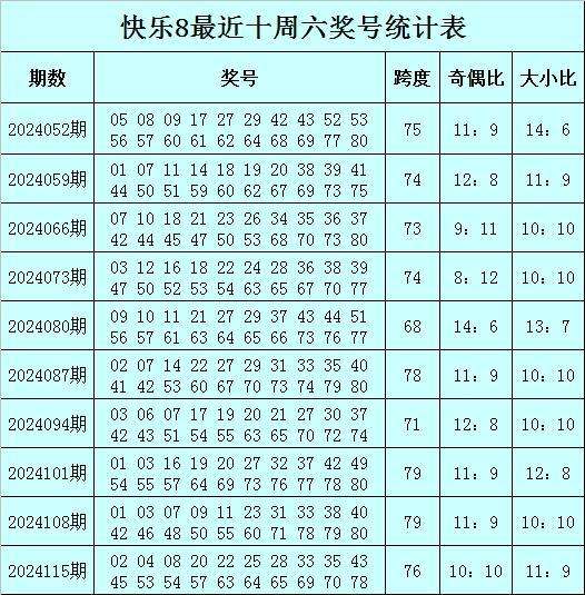 福彩快乐8第2024115期开奖回顾:02 04 08 20 22 25 28 33 35 43 45 53 54 57 63 64 65 69 70 78,其中奖号奇偶比为10:10,大小比为11:9,012路比为7:7:6,首尾间距为76。