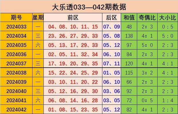 大乐透上期奖号为:前区01、08、15、23、35,后区05 12;和值82,奇偶比为4:1,大小比为2:3。