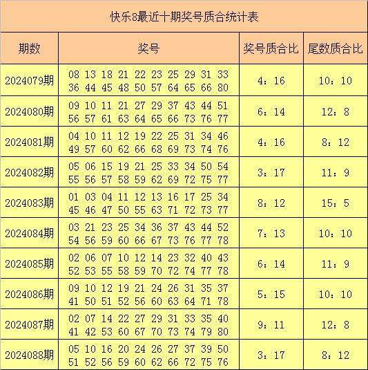 福彩快乐8第2024088期开出奖号:05 10 16 20 24 26 27 37 39 50 51 52 56 59 60 62 66 72 75 76,其中奖号质合比为3:17,奖号尾数质合比为8:12。