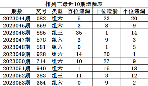上期回顾:排列三第2023053期奖号:364,组六,直选遗漏总值为11期。