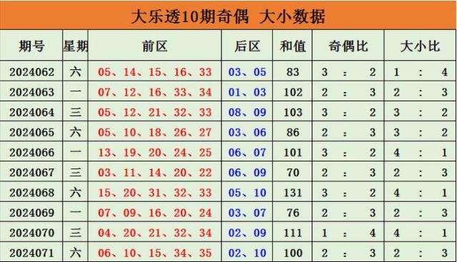 大乐透第24071期开奖。当期开奖号码为:前区06 10 15 34 35,后区02 10。当期前区号码大小比为2:3,奇偶比为2:3,三区比2:1:2;前区开出1枚重号34,开出1组连号34 35;后区开出小大组合02 10。
