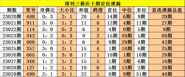 开奖回顾:排列三第2023029期奖号:499,定位直选遗漏值8期、9期、31期,遗漏总值为48期。