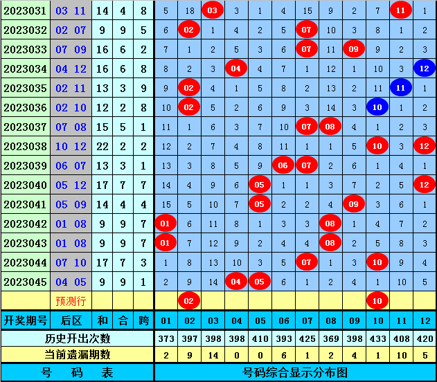 后区分析:后区上期开出1路和2路奖号04和05,最近20期后区奖号012路比为13:14:13,最近两周后区奖号012路比为2:5:5本期后区注意号码01、02、06、10、11,单挑两码注意1路号和2路号02、10。