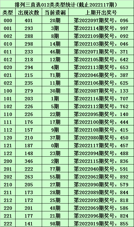 上期回顾:体彩排列三第2022117期开出奖号:457,其012路比为0:2:1,奖号012路类型为:121。