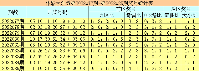 体彩大乐透第2022085期奖号为11 16 31 33 35 + 06 08,前区号码五区比为0:1:1:0:3,奇偶比为4:1,012路比为1:2:2,后区号码奇偶比为0:2,大小比为1:1。