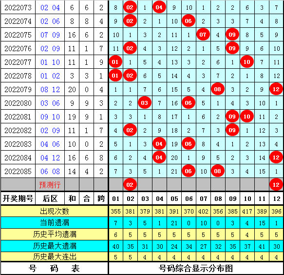石浩第2022086期大乐透后区分析:后区上周星期六后区奖号为04和06,上期开出奖号06和08,最近9周星期六与最近9期后区奖号大小比分别为7:11和8:10,奇偶比分别为8:10和5:13,本期看好后区出现全偶组合,关注号码02、08、10、12。