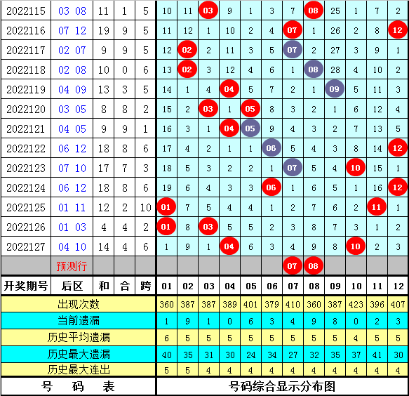 彤彤第2022128期体彩大乐透后区遗漏分析:(定义:后区遗漏0-3期号码为热码,遗漏4-9期号码为温码,遗漏9期的号码以上为冷码)