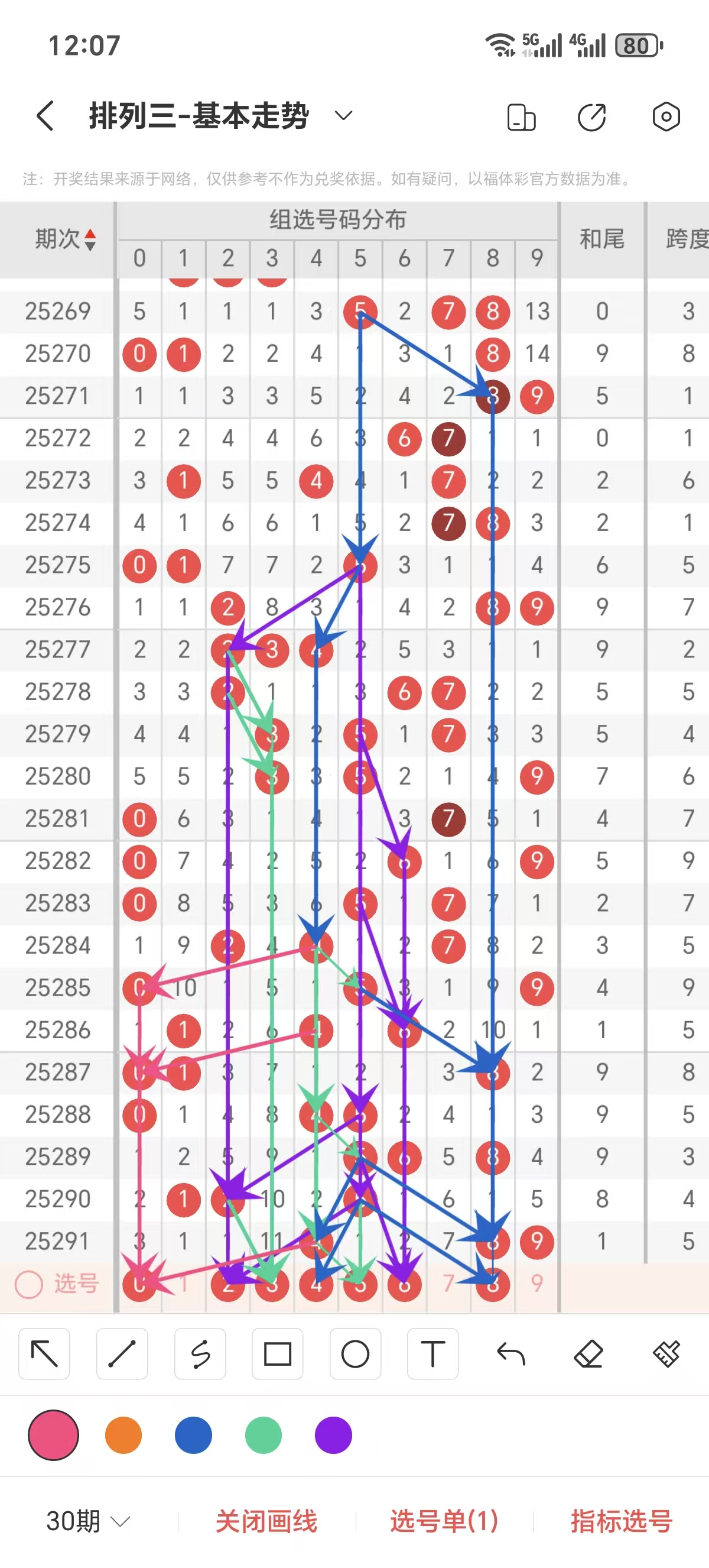 通常情况下在五期之内重复一个跨度的概率较高,近五期重复了5的跨度,近五期跨度为8/5/3/4/5,近期2路的跨度较热,本期要侧重3/4跨为主的号码组合。选择好跨度就可以从跨度方面选择相应的双胆码组合,双胆码的选取要根据近期和历史的走势进一步的分析选取。