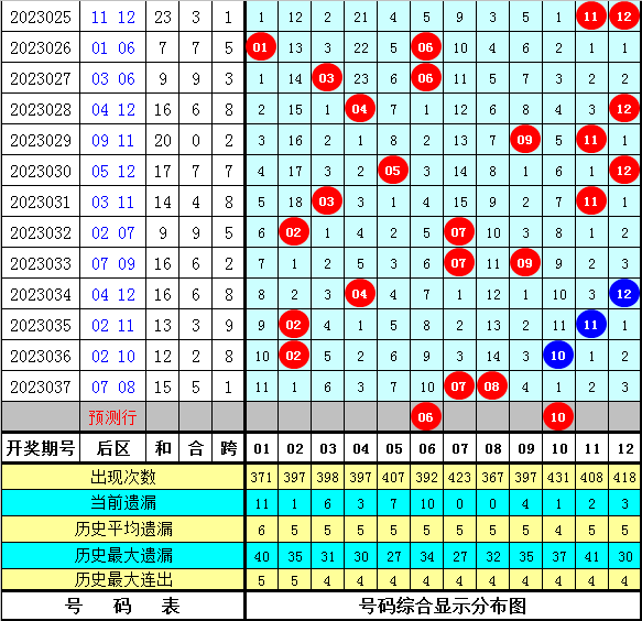 后区分析:上期后区奖号为07+08,本期后区注意重复号码出现,大范围参考号码01、06、07、10。
