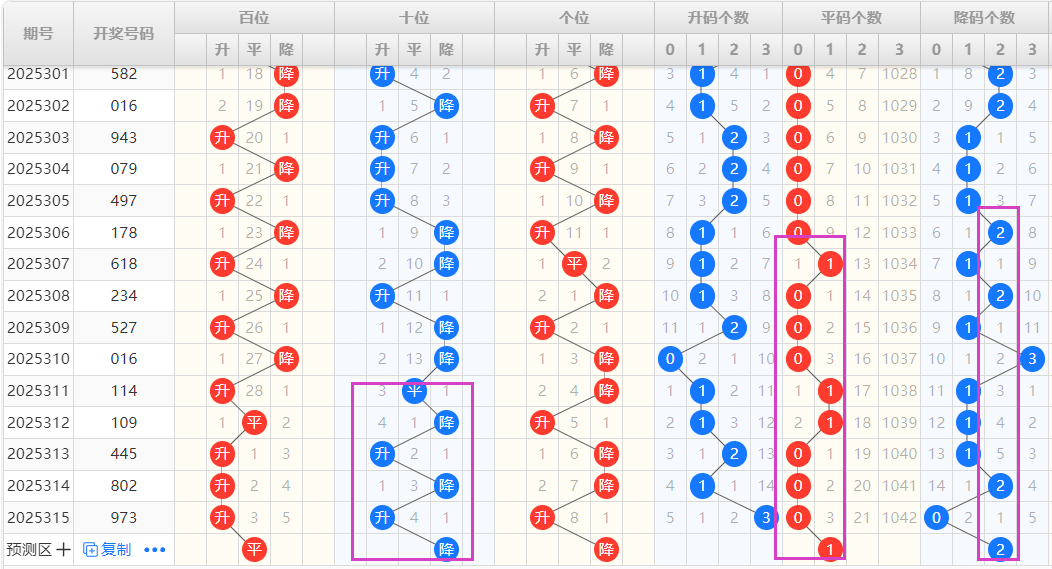 【排列3个位】:近十期升降走势为:降-升-降-降-升,为一种单一加重复性的交错走势,结合走势图可以看出,图中紫色框圈出为一种M形态的出球方式,本期可以重点看好升的形态号码的开出。