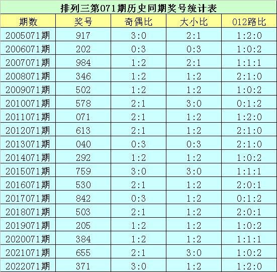 排列三第2023071期开奖日期:2023年3月22日,历史上第071期已开出了18次奖号,历年同期号码分别为:917、202、984、346、502、578、071、613、040、292、759、530、842、503、205、384、655、371。