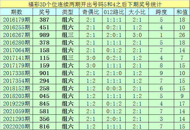 个位号码:最近两期个位开出号码为5-4,在福彩3D历史开奖中,前后两期个位分别开出号码5-4的奖号出现了69次。最近15期个位5-4组合出现之后,其下期奖号分别为:387-451-989-378-158-115-159-901-294-258-045-845-581-356-816;