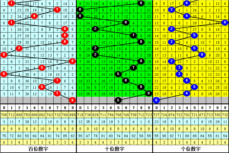 其中,该位号码开出012路比为12:14:19,奇偶比为27:18,本期预计该位出现偶号,独胆参考0。