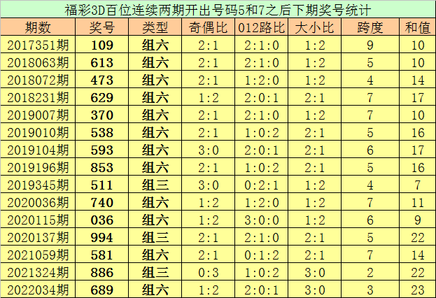 百位号码:连续两期百位出号分别为:5-7,历史上福彩3D连续两期前后分别出号5-7的奖号共出现83次。在百位5-7的奖号现象出现时,近15期下期分别出号:109-613-473-629-370-538-593-853-511-740-036-994-581-886-689;