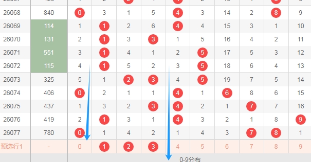 上图是体彩排列三开奖号码走势分布图,我在上面标注出来的蓝色箭头中间这个区域的数字123上期一个数字没出现,最近两期这个区域出号码一个,那么本期这个区域出号码的机会是有的,关注这个区域的数字123出一个或者两个。