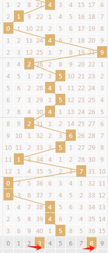 上图是体彩排列三开奖号码走势分布图,我在上面标注出来的数字当一个区域的话,这个区域的数字可以看成890123456,这个区域的数字组成的连号组合有89 90 01 12 23 34 45 56一共有8组,这8组连号组合已经遗漏了两期,那么本期可以关注这些组合出现。