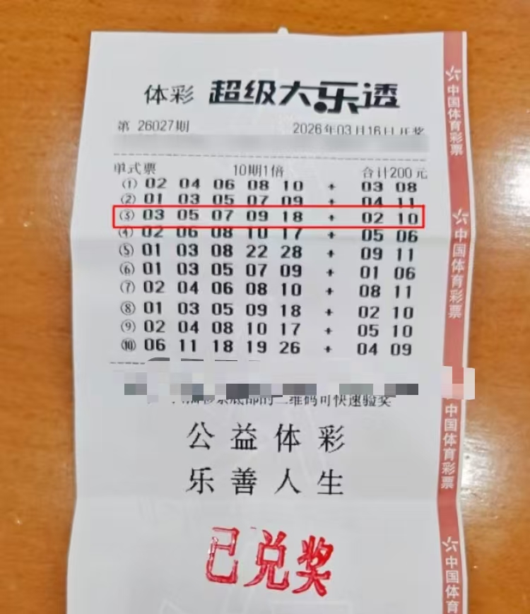 2026年3月30日,超级大乐透第26033期开奖,前区号码03、05、07、09、18,后区02、10。上海浦东新区xxxx号体彩网点惊爆喜讯:一对父子以一张200元的"10注连投10期"多期票,中得当期基本一等奖1注,累计奖金562万元!