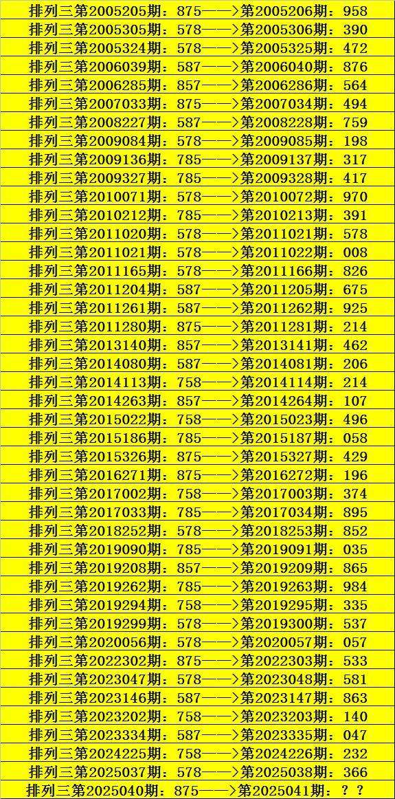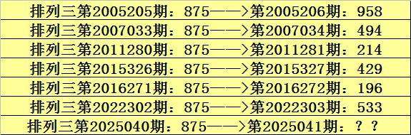 第2025040期排列三奖号为875,历史上该号码直选出现7次,下期奖号分别为:958、494、214、429、196、533。