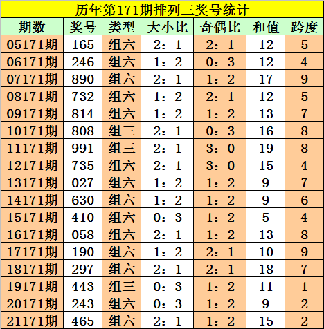 历年第171期排列三奖号:165 - 246 - 890 - 732 - 814 - 808 - 991 - 735 - 027 - 630 - 410 - 058 - 190 - 297 - 443 - 243 - 465。