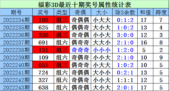 上期回顾:上期开奖奖号为638,类型:组六,偶奇偶,大小大,2:0:1,和值17,跨度5。
