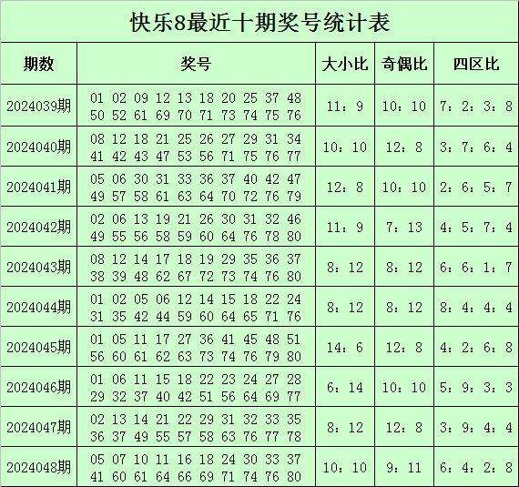 福彩快乐8第2024048期开奖回顾:05 07 10 11 16 18 24 30 33 37 41 60 61 64 66 69 71 74 76 80,其中奖号四区比为6:4:2:8,奇偶比为9:11,大小比为10:10。