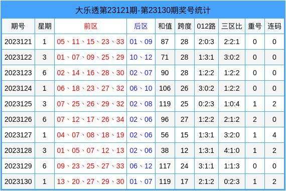 上期回顾:大乐透23130期开出奖号:前区13、20、27、29、30,后区01、07。