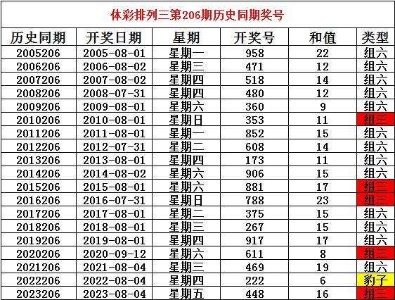 2024年8月3日排列三第206期开奖,历史同期分别开出奖号: