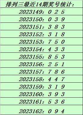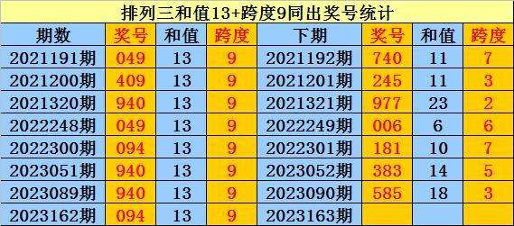 上期回顾:排列三第2023162期奖号:094。和值13,跨度9。